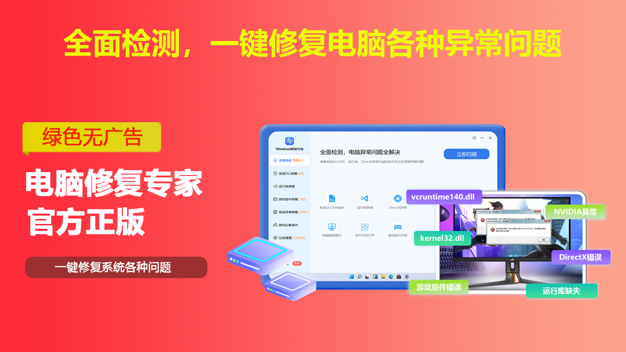一键智能识别并修复电脑各种异常,快速恢复电脑最佳状态。提供非常全面的电脑常见异常解决方案,修复缺失DLL、运行库异常、电脑无法上网等相关问题,让您的游戏和软件运行无阻。