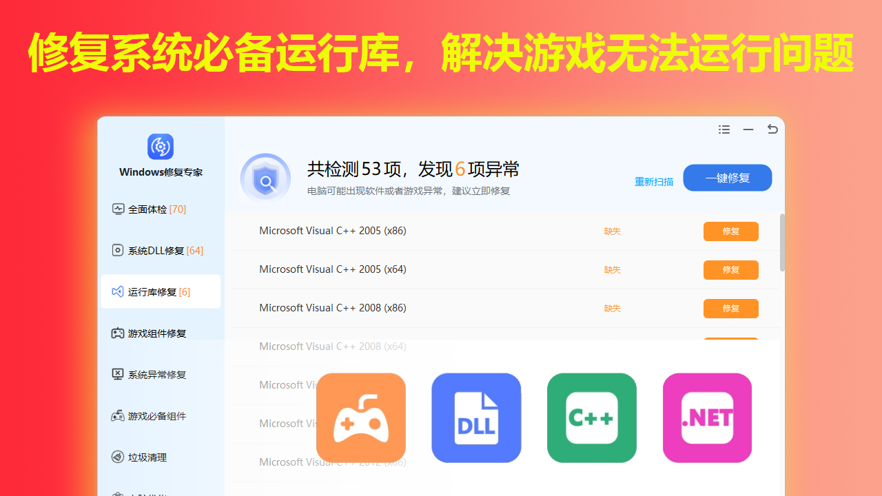 【运行库修复】修复系统必备的常用运行库,解决因运行库缺失引起的dll丢失或程序无法运行等问题,包括C++运行库、.NET运行库、游戏库等的下载。