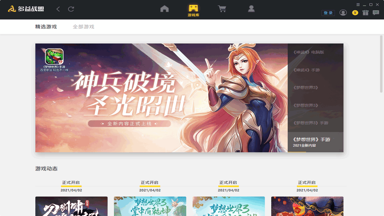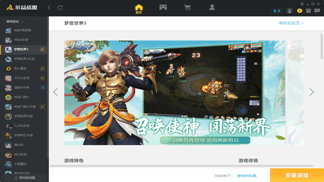 多益战盟电脑版是多益网络旗下的一款官方游戏客户端,是多益游戏官方助手,为广大神武系列、梦想世界系列、第十域和永恒魔法等多益游戏玩家带来许多实用的功能,致力于为玩家提供一站式畅玩多益精品游戏,内容前瞻还有礼包福利,打造集游戏、沟通、社区、工具为一体的综合社区。帮派、社区、好友、攻略随时查看,全新游戏社区,专属游戏礼包,尽在多益战盟。多益战盟让虚拟的游戏感受到真实的幸福!