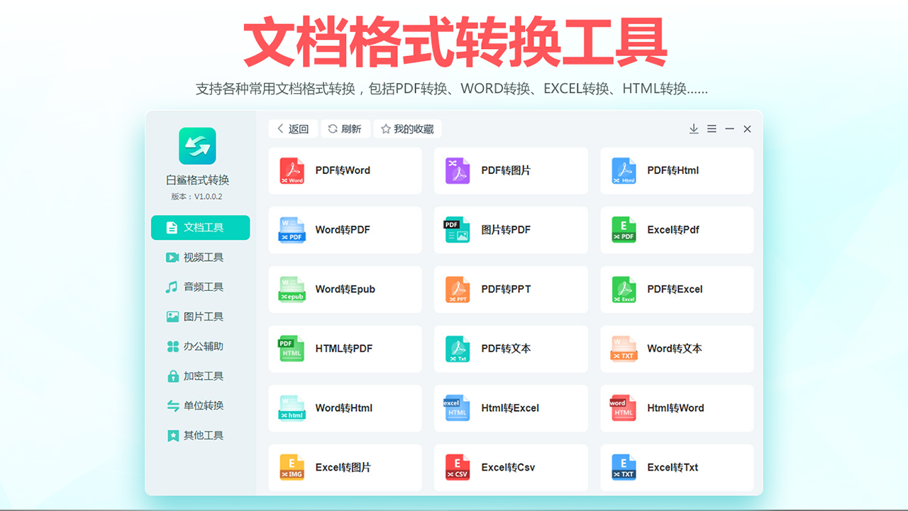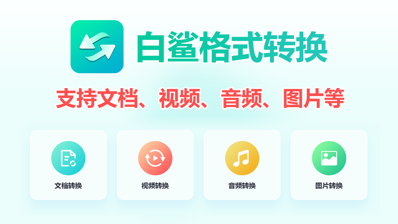 白鲨格式转换软件支持各种文档转换、图片格式转换、视频转换、音频格式转换器、PDF转换,以及提供各种办公辅助工具,包括PDF转Word、PDF转图片、Word转PDF、Excel转PDF、图片转PDF、PDF转PPT、MP4转换、jpg转换、png转换、webp转换、mp3转换、wav转换等功能。