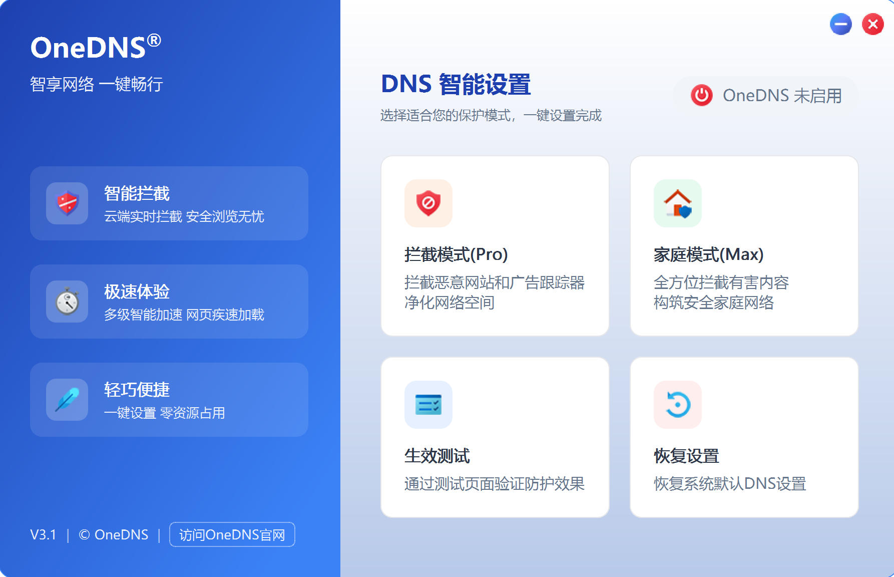 OneDNS是一个安全、快速、免费的DNS服务。通过它,您可以时刻畅享来自云端的恶意网站屏蔽服务,彻底摆脱无良ISP的DNS污染与劫持,同时横跨南北的高速线路加速您的网络连接。OneDNS一键设置客户端可以实现Windows系统上一键设置OneDNS,同时支持一键取消。软件无需安装,可直接运行。。